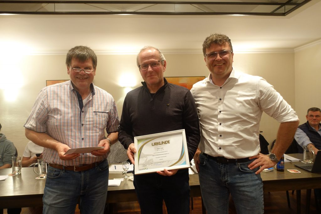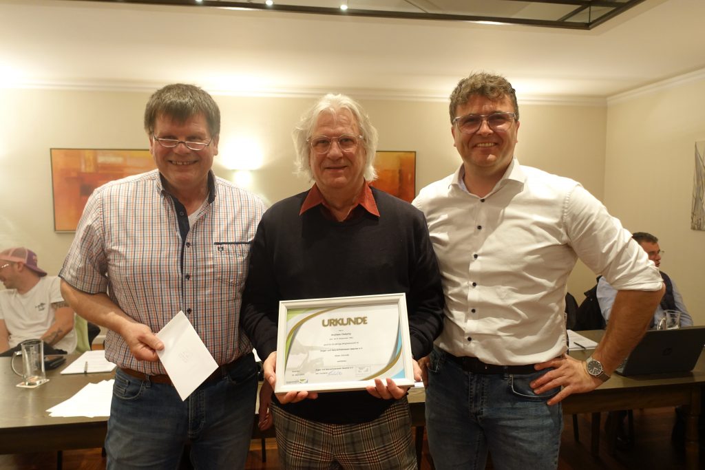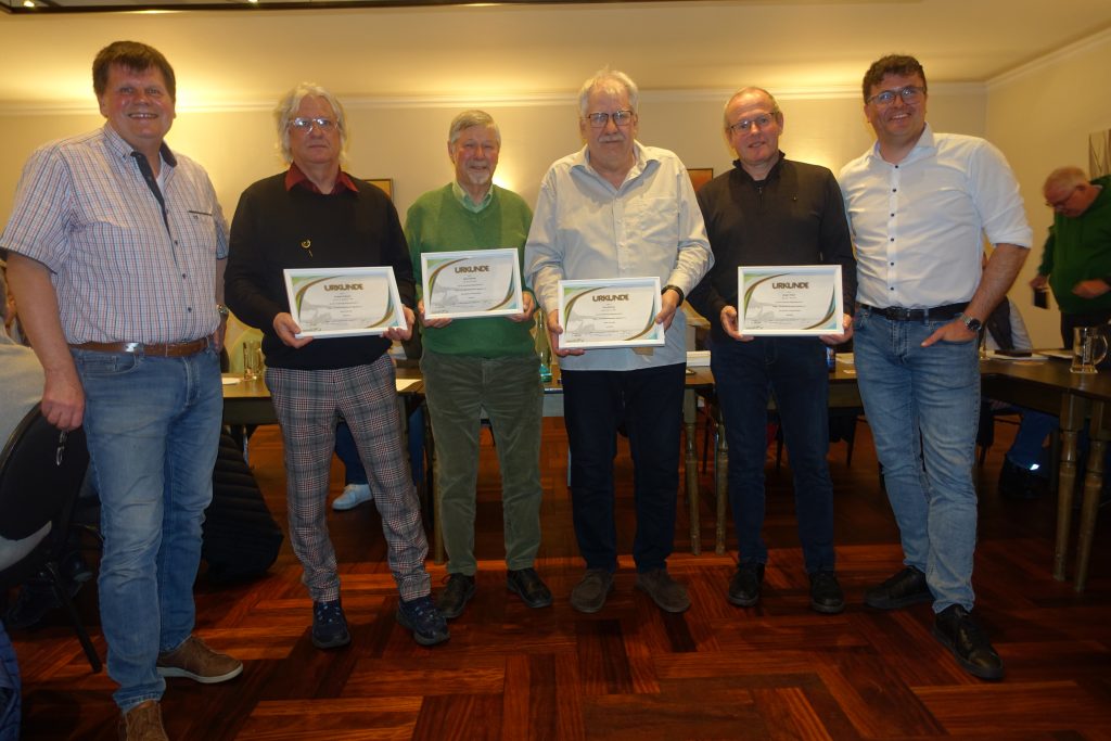 Sebastian Terhechte und Peter Ploß nahmen abschließend die Ehrungen der ANV-Jubilare vor. Für 50-jährige Mitgliedschaft erhielten Theo Brüning und Andreas Oskamp die goldene Verbandsurkunde. Die goldene Verbandsurkunde mit Nadel für 40-jährige Mitgliedschaft erhielten Siegfried Sonntag, Heinz Günther und Jürgen Hisker.